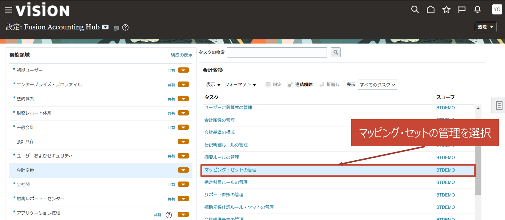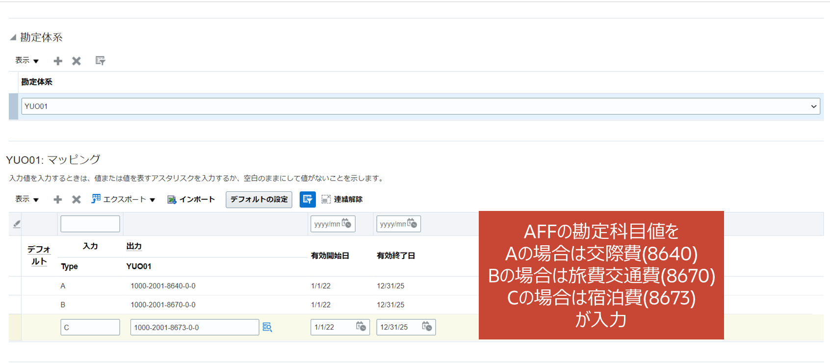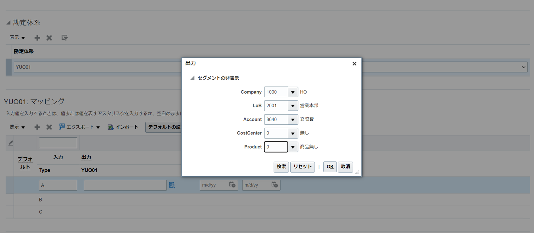 前回は7摘要ルールについて設定しました。今回、設定の説明するのは6マッピング・セットと5勘定科目ルールになります。マッピング・セットは取引の入力値(例: 取引タイプ、BUなど)をキーに、勘定科目の特定のセグメント値を返す参照表になります。そして勘定科目ルールは仕訳の勘定科目(全体または各セグメント)を、マッピング・セットや定数、条件式などで導出するルールです。つまりマッピング・セットは入力値に対して勘定科目値を決定する変換ロジックの一つで、勘定科目ルールは変換ロジックの方法を選ぶルールとなっております。