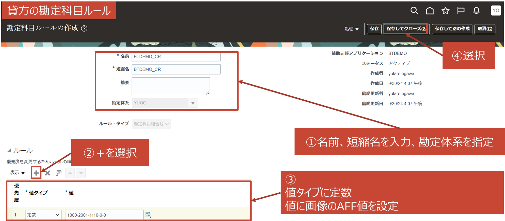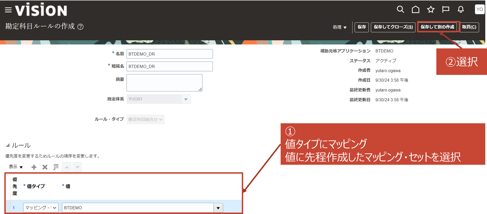 勘定科目ルールは、作成ルールが出力予定の仕訳の貸方と借方と違う場合には、それぞれ作成する必要があります。今回は、借方には作成したマッピング・セットで、貸方には定数を利用するので、2つ作成します。