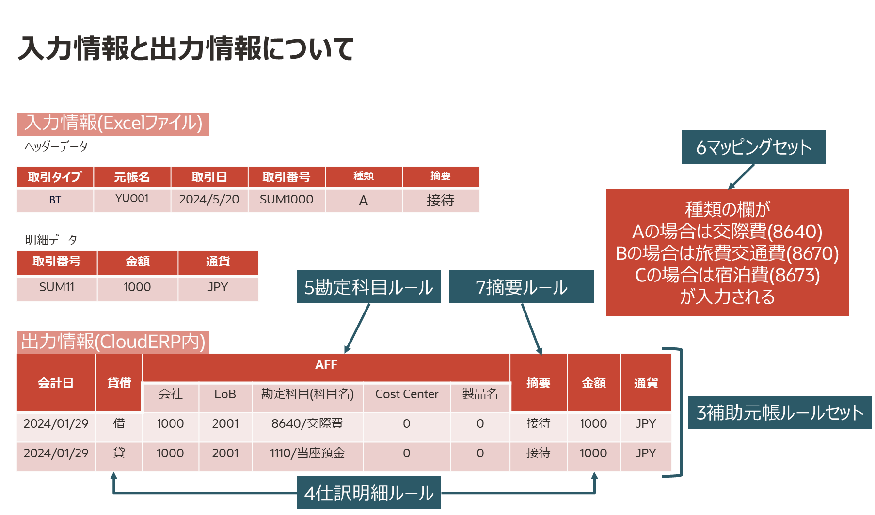 入力情報と出力情報についてイメージに対して、先程の項目に対して、仕訳のどの部分を設定しているかをマッピングしたものになります。1つ1つの項目について後ほど説明をしていきます。