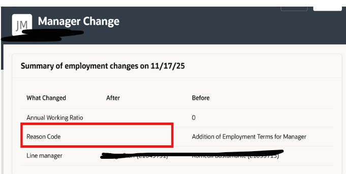 With 25D, when a change of direct report is included when hiring a new employee, the action reason associated with the manager change is not appearing in the employee record once the new hire has been processed.