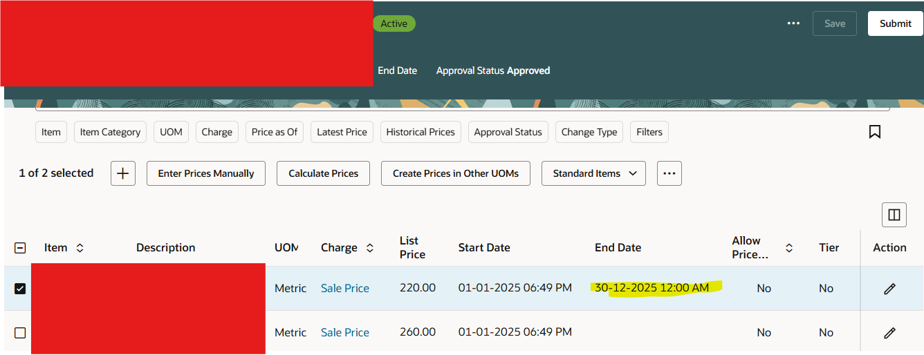 Redwood Price list screen End date Line