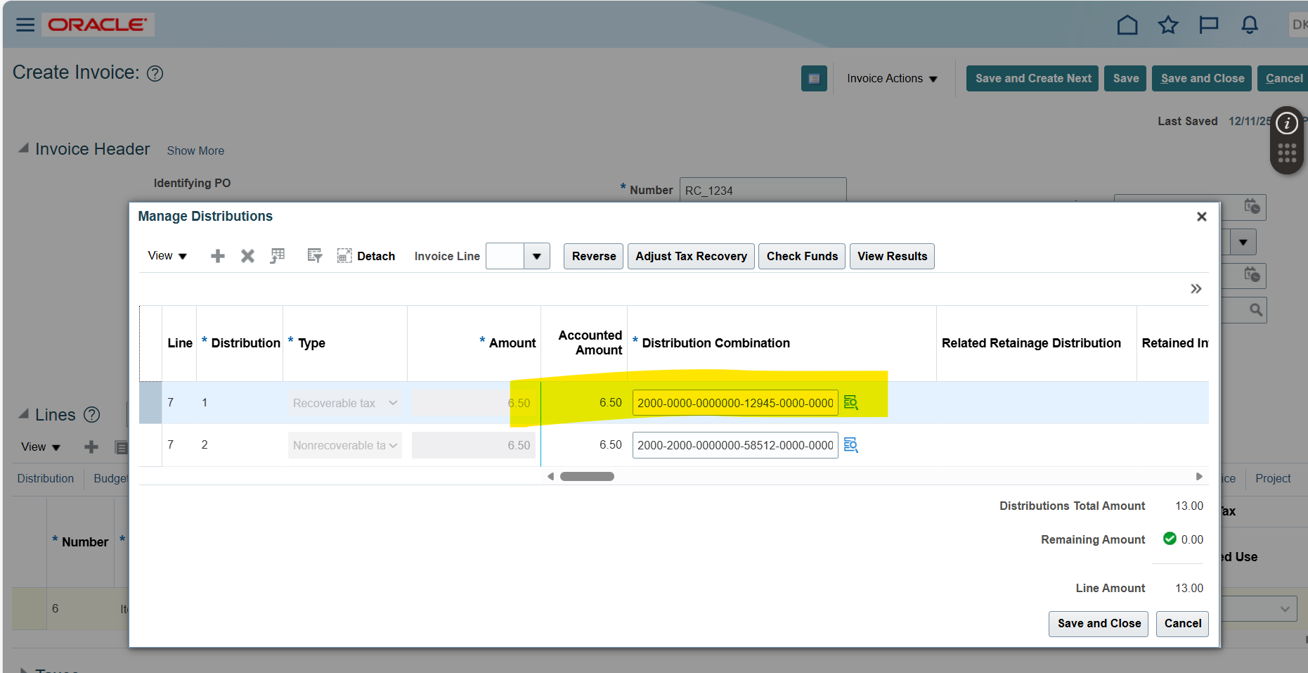 We have a requirement to allow user to manaully override the Recovery tax rate at the AP invoice line level. User is able to override the Recovery tax rate, but after overriding also distribution combination is not getting updated as per the new Recovery rate. Is there any setup/option that needs to be enabled to update the distribution combination as per the new Recovery tax rate.