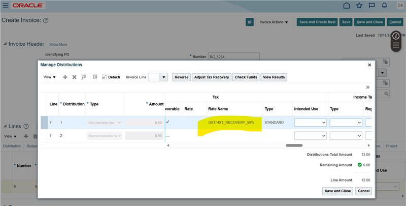 We have a requirement to allow user to manaully override the Recovery tax rate at the AP invoice line level. User is able to override the Recovery tax rate, but after overriding also distribution combination is not getting updated as per the new Recovery rate. Is there any setup/option that needs to be enabled to update the distribution combination as per the new Recovery tax rate.