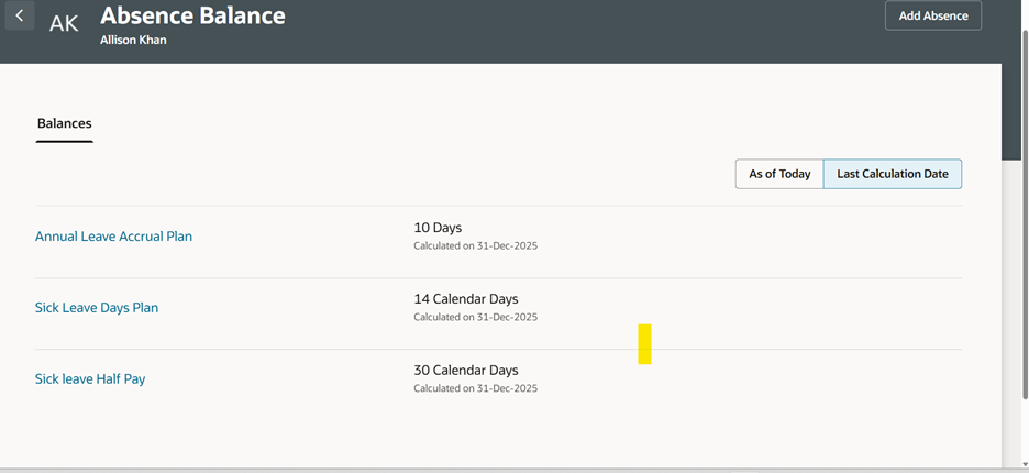 Absence Balance mismatch on add absence and Absence Balance Page
