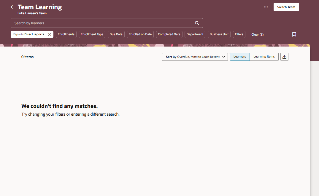We're facing an issue with manager not being able to view employees/reports under Team Learning and Team Goal Center. We cannot assign learning via direct reports specific person - the people are not searchable.