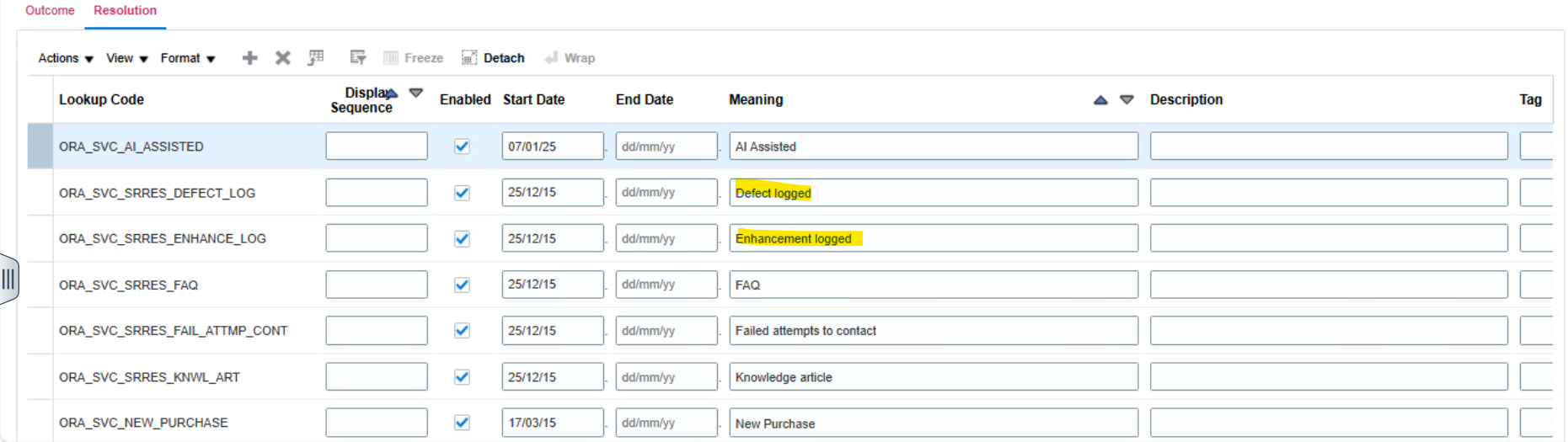 When we are selecting the Outcome as unable to solve - not values are populated in Resolution code LOV.
