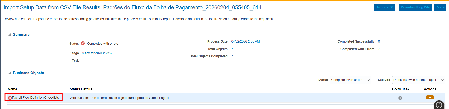 The warning log in the export file says that the definition of the business object for the XML Node /FlowsSetupVO/FlowsSetupVORow/FlowsSetupParameterVO/FlowsSetupParameterVORow/FlowsSetupParameterPropertiesVO/FlowsSetupParameterPropertiesVORow of the file XML_PAY_FLOWS_VL.xml could not be found.
