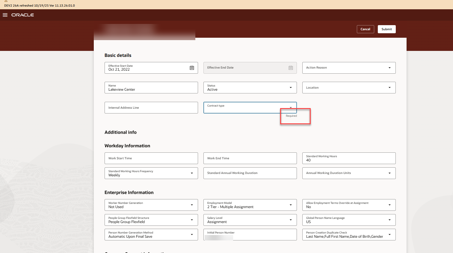 We are trying to remove the requied "contractor type" from Enterprise HCM Info DFF but its greyed out in VBS. I also dont see this dff in Manage DFF through setup and maintenance. Where can we change this? It only prompts for a value if we make changes to the Global Payroll Element section.