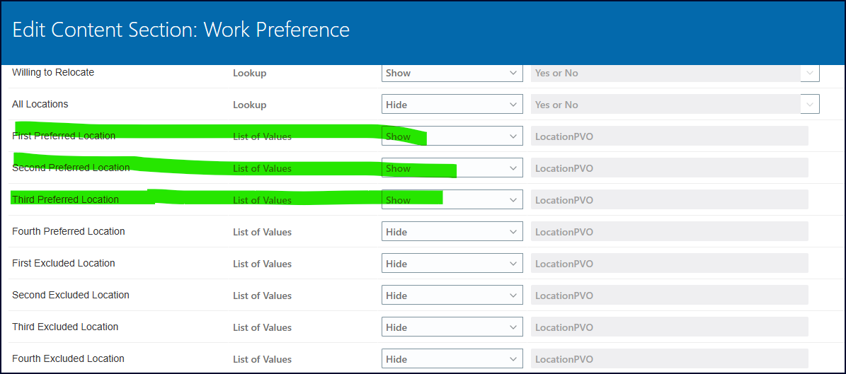 We have configured the Talent Profile — Candidate Profile with fields enabled for First Preferred Location, Second Preferred Location, Third Preferred Location. But the Career site only displays one field which is Preferred Location