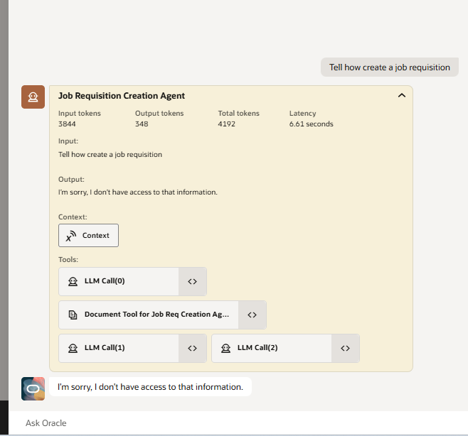 However, I can not see any answer for a simple question, even I can see my Tool document *ReqDocument3 when I am testing this agent