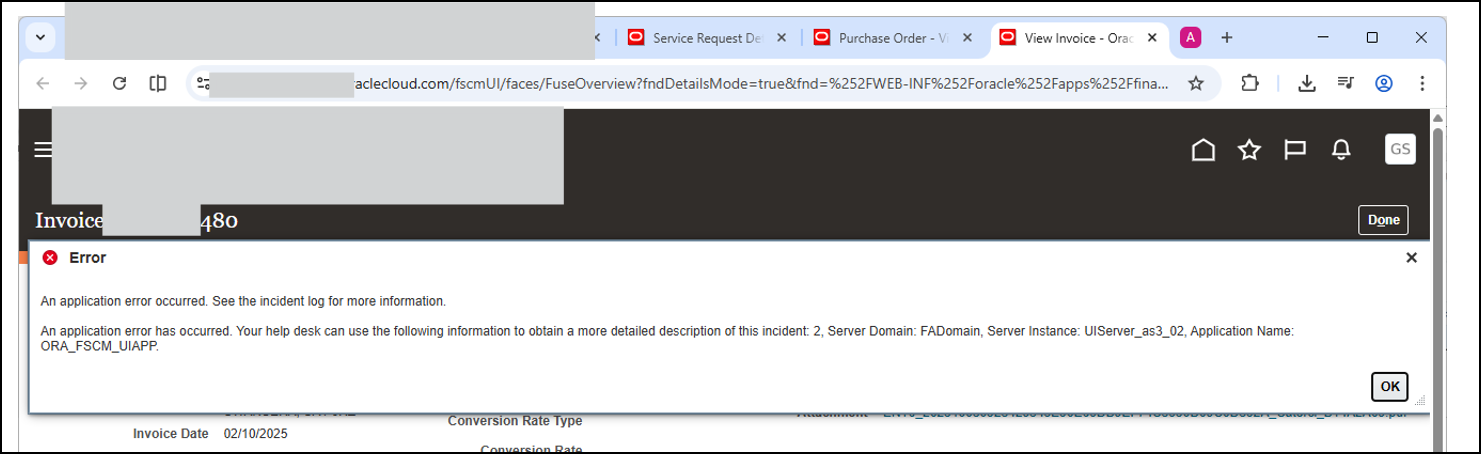 An application error has occurred. Your help desk can use the following information to obtain a more detailed description of this incident: 4, Server Domain: FADomain, Server Instance: UIServer_as3_02, Application Name: ORA_FSCM_UIAPP.