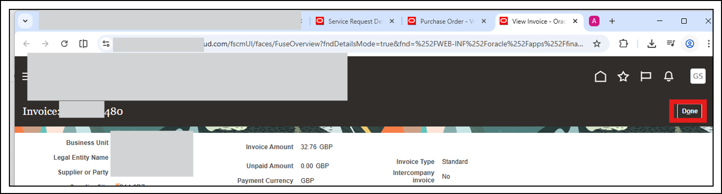 d) On invoice screen, click "Done" when finished viewing invoice: