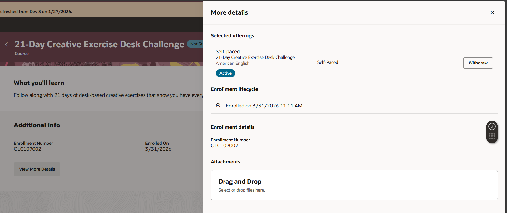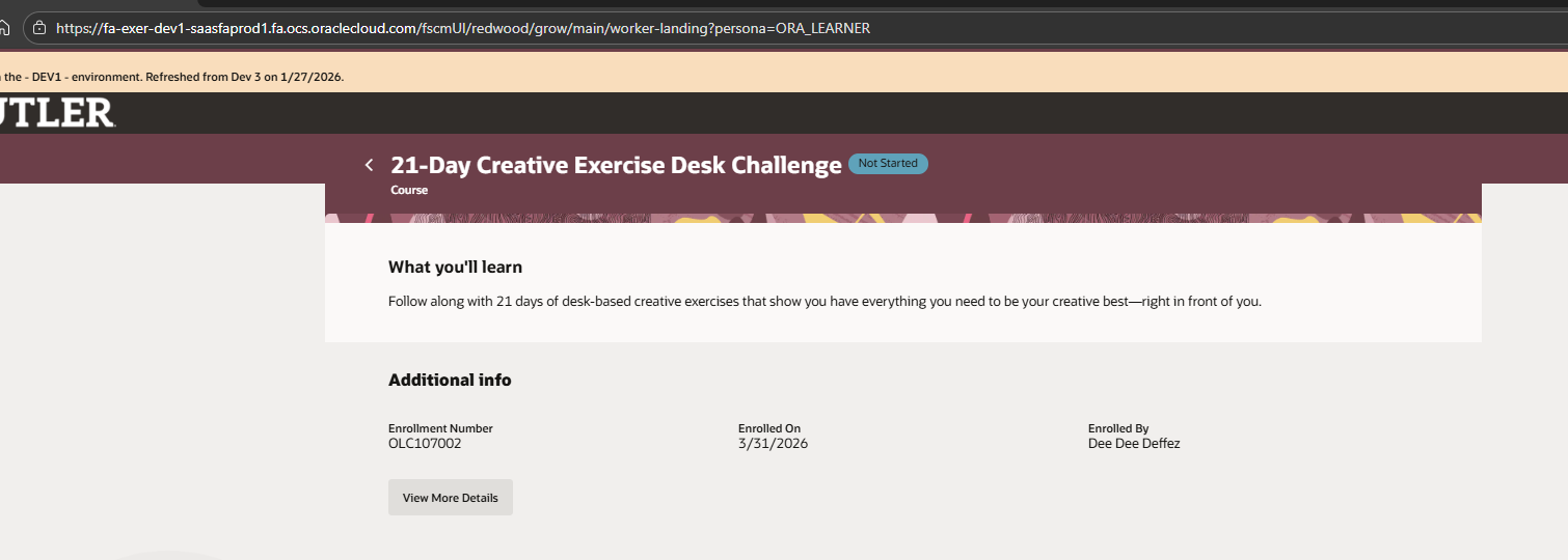 I have turned on this course as active for employee to Enroll. The Enrollment button shows and you can click Enroll but then there is nothing to take. When you click view more Details it gives option to Withdraw but no option to take the course.