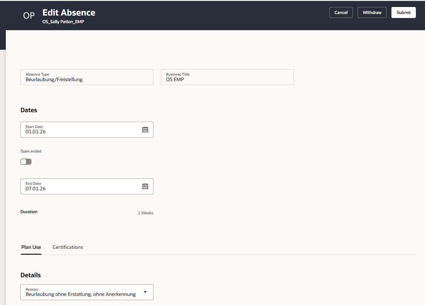 On e.g. Me > Existing Absences I can see the following page open, this is clearly Redwood UI: