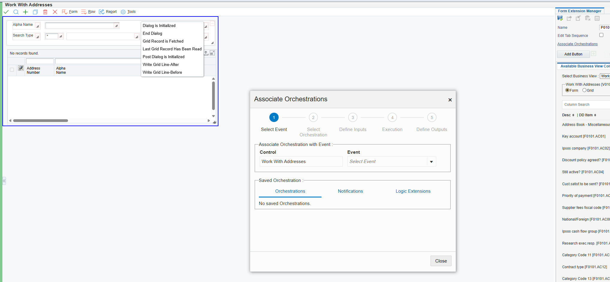 Click Associate Orchestrations then click just below the blue line that is around the form, then pick the event (dpending on the form there are different events) Note End Dialog gets executed on closing and 'OKing' a form though