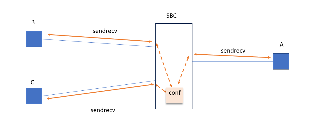 If SBC had a conference functionality, as Antonio said, there would be one more entity inside SBC, that would collect all media flows and mix them. I assume that such call would look like three pairs of nat flows: A<>conf, B<>conf and C<>conf.