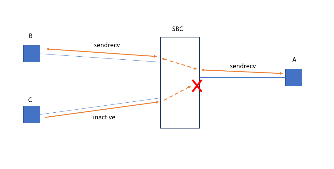 Literally SBC cannot connect one INPUT with two OUTPUTs simultaneously. At maximum, SBC can place one OUTPUT on hold - shut down its media flow by placing it in inactive mode and connect INPUT to another OUTPUT by setting their media flows to sendrecv mode.