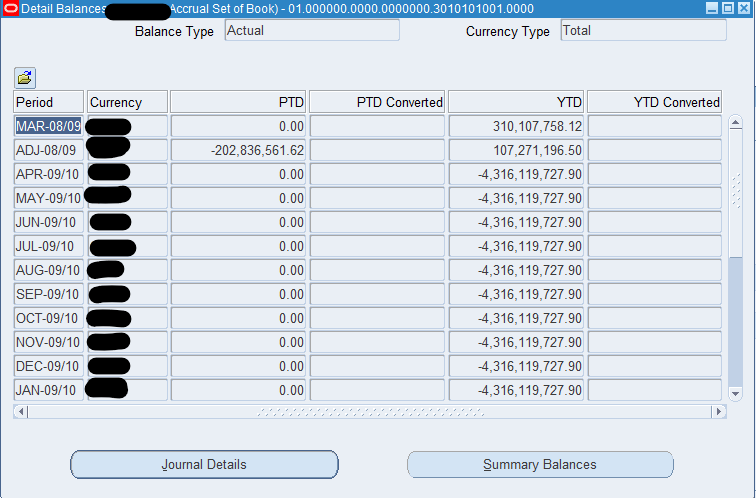 My client discovered huge balance variance in one of the accounts between period Adj-08 to Apr-09 without any details as in Adj-08 the ending balance was 107,271,196 then the beginning balance in the next month became 4,316,119,727 which should be the same as ended