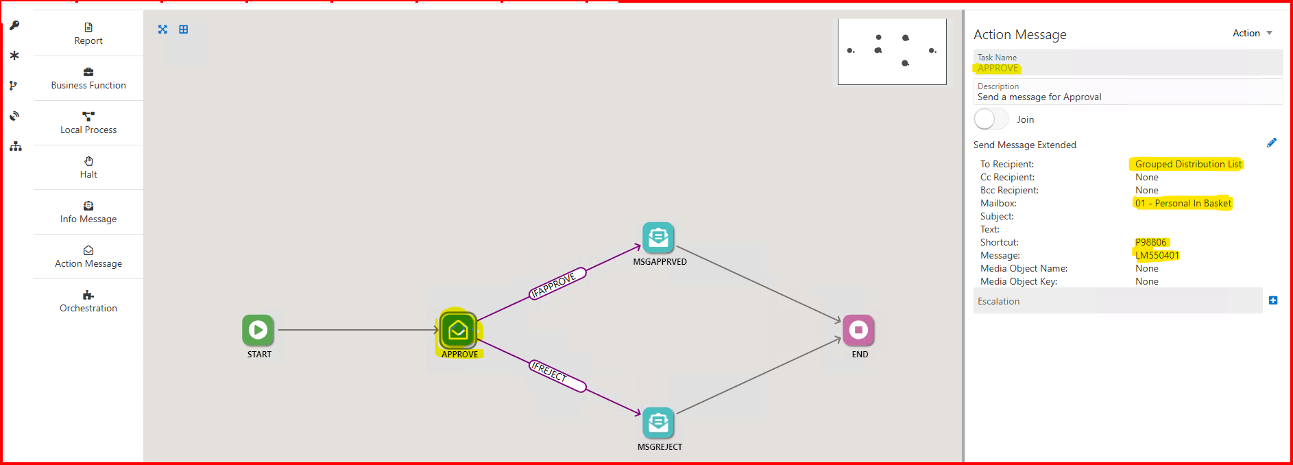 4. My Workflow, is very simple, I call the program P98806 pour approval, if yes I sould receive a message "Approved" et rejected, I should receive a message "Rejected". I checked on the log, nothing talking about my Workflow.