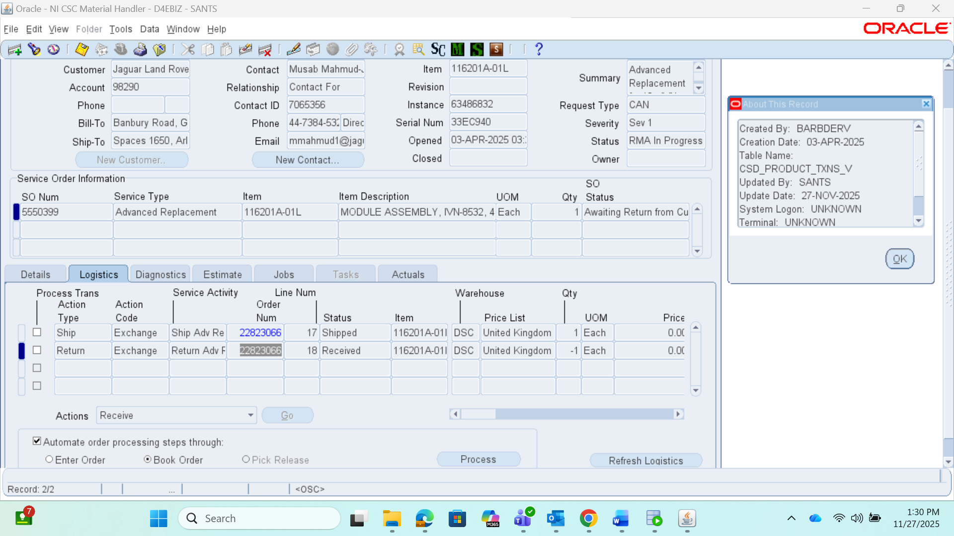 User reported as issue is affecting all the Advance Replacement SOs created before the Oracle Upgrade go-live. As of 2 Dec, there are over 100 impacted SOs awaiting receiving.