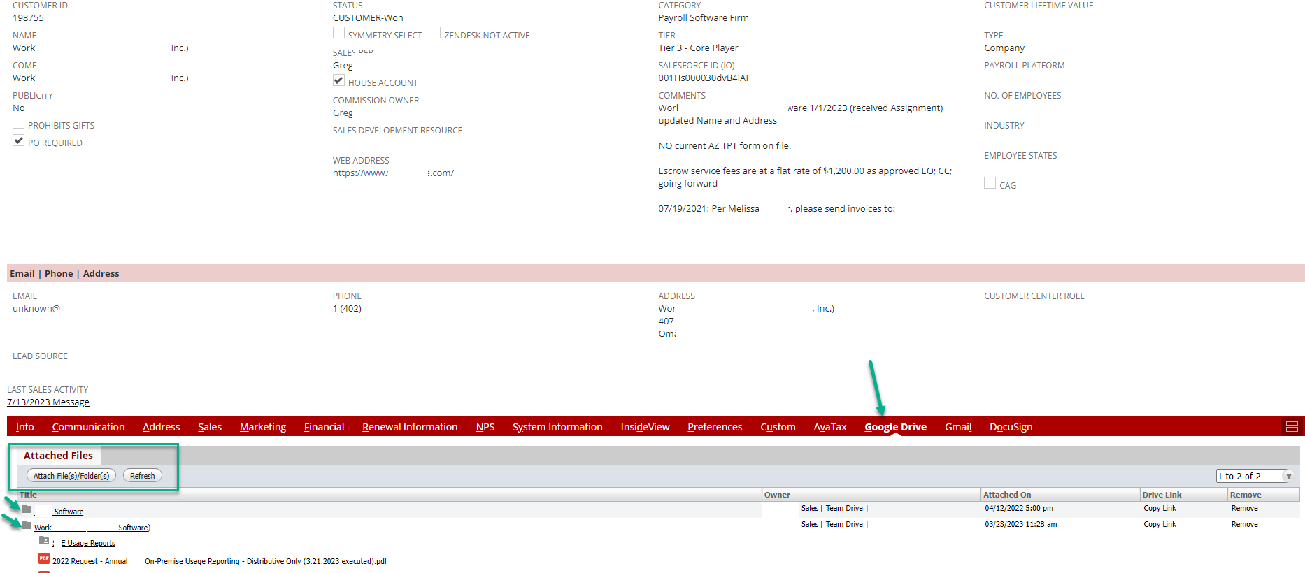 Once the folder is on the NetSuite record (Entity, Contact, Transaction, etc) you can also drag & drop any new files to the folder on the record & it is stored in the source folder on our Google Drive….