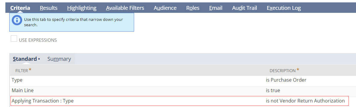 Re: In a Saved Search can I filter Purchase Orders that have a Vendor Return Authorization