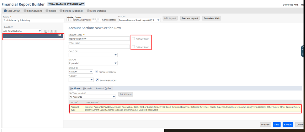 The customized report uses the Balance Sheet structure but is redesigned to behave like a Trial Balance. This is achieved by: