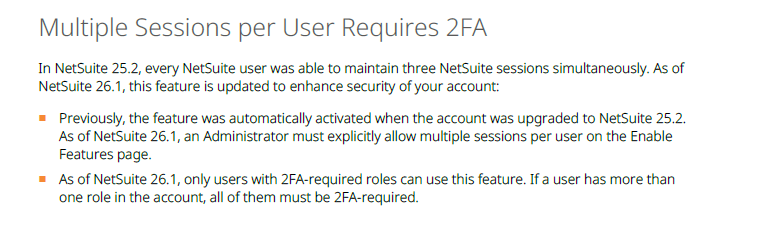 Re: NetSuite Release 2026.1 Multiple sessions per user requires 2FA