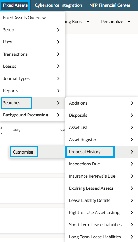 - Navigate to Fixed Assets > Searches > Proposal History > Customize