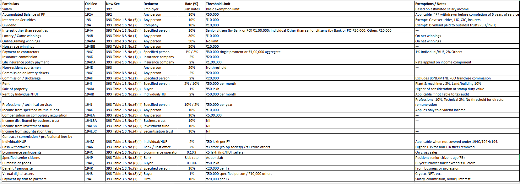 One of the most significant changes introduced by the new law is the restructuring of TDS and TCS provisions. Under the earlier Act, Tax Deducted at Source (TDS) provisions were spread across many sections such as 192, 194A, 194C, 194H, 194J, 194Q, etc.