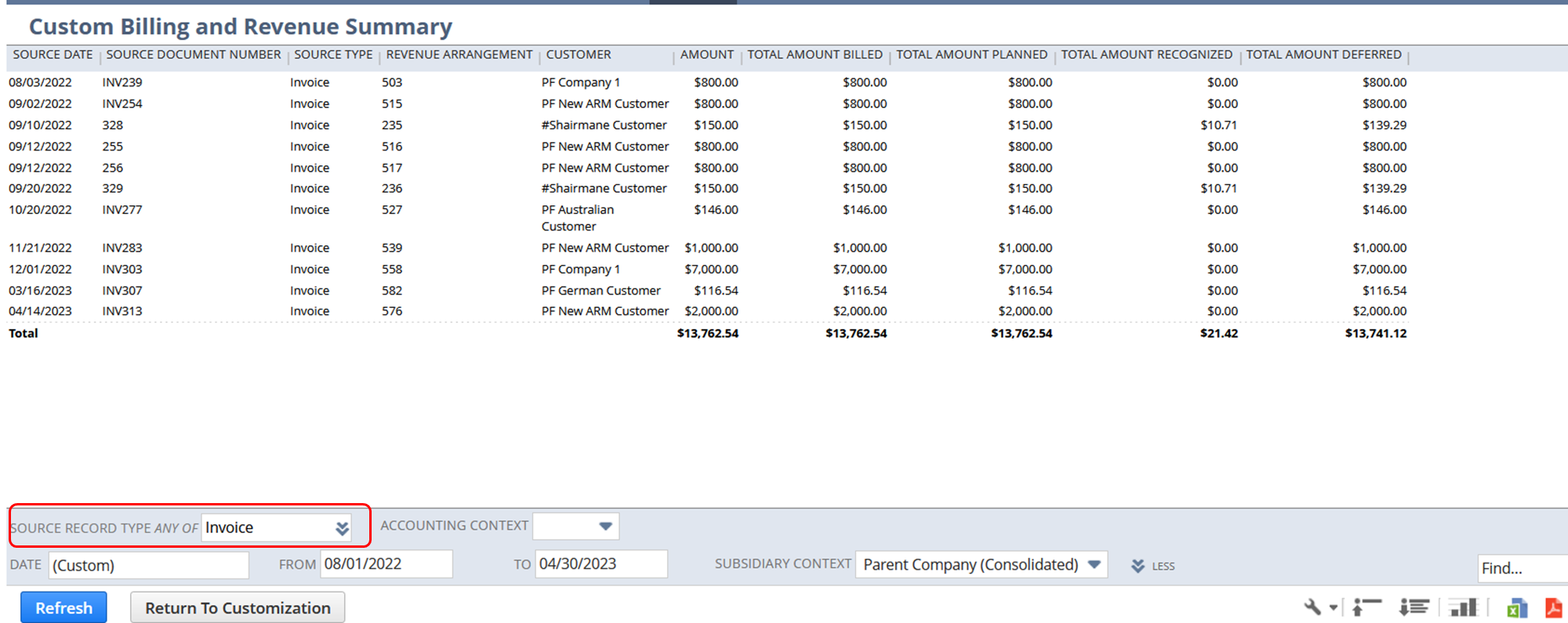 Billing and Revenue summary displays Revenue amounts, their Source Documents, Source Types etc. This includes deferral data for sales transactions and project. In some cases, users might want to filter the report to a specific transaction type, here's how to achieve this: