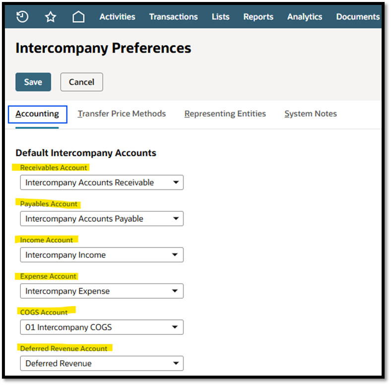 1. Using an Administrator role, navigate to Setup > Accounting > Intercompany Preferences.