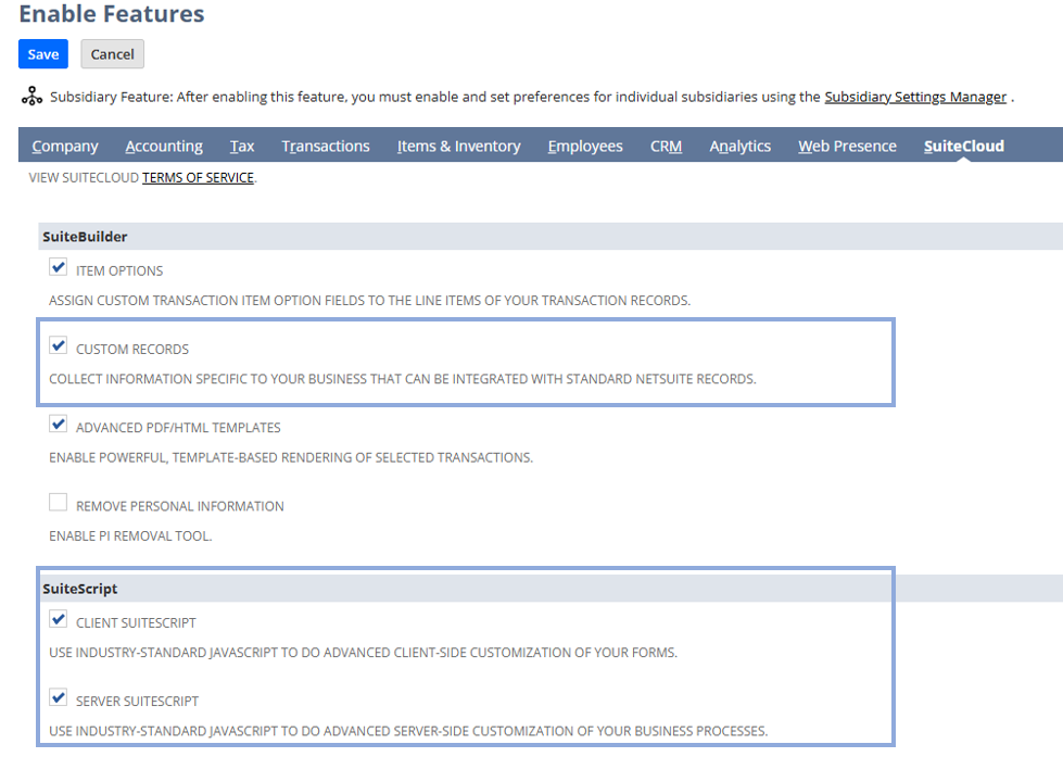 - For Server SuiteScript and Client SuiteScript, you must agree to the SuiteCloud Terms of Service when enabling them.