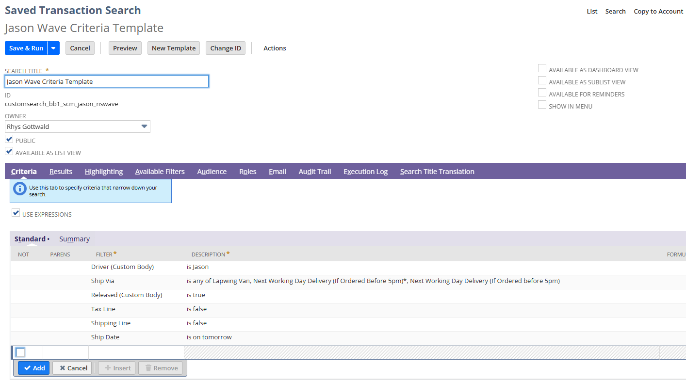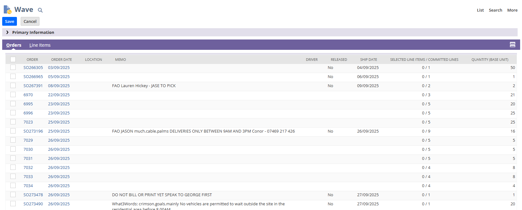 But if I run the search out of the wave criteria, the results of this wave are vastly different with far more Sales Orders and also includes Work Orders