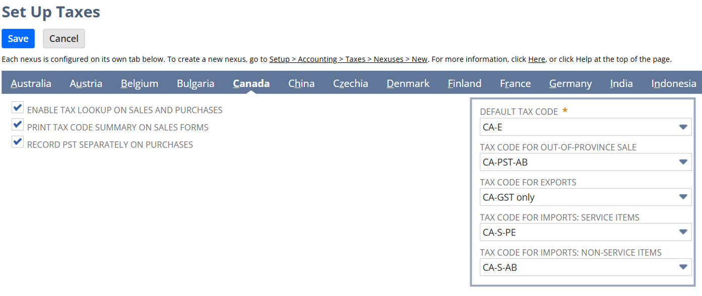 カナダNexusの「税金の設定」ページで、選択した税金コードは次のとおりです: