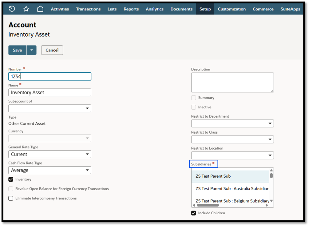 ノート: 親である子会社が選択され、「子を含む」ボックスにチェックマークが入っている場合、その勘定科目はすべての子会社からアクセス可能になります。