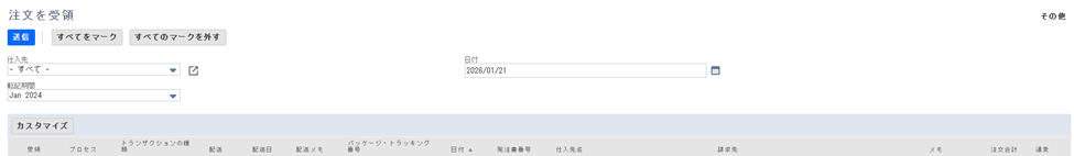 レコードへのアクセス方法:「トランザクション > 購入 > 注文を受領」からアクセスできます。