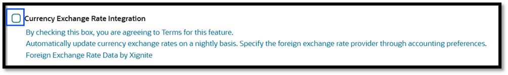 ノート: 「通貨為替レート統合」ボックスにチェックマークを入れるには、最初に「複数通貨」ボックスにチェックマークを入れる必要があります。
