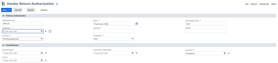レコードにアクセスするには、「トランザクション」>「購入」>「返品の入力」にナビゲートします。