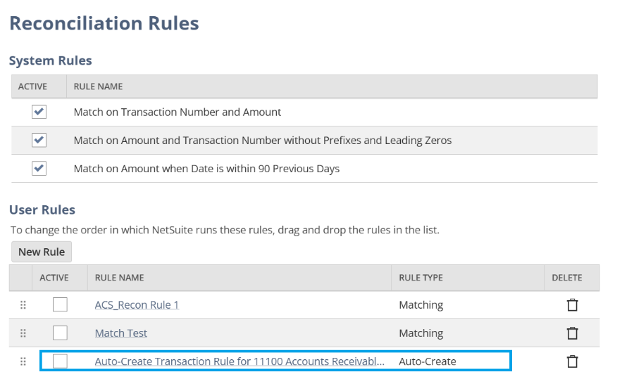 照合ルールを使用した銀行トランザクションの自動作成は、NetSuiteの標準機能です。SuiteAnswers ID 95134によると、自動作成ルールは次のことを実行できます。