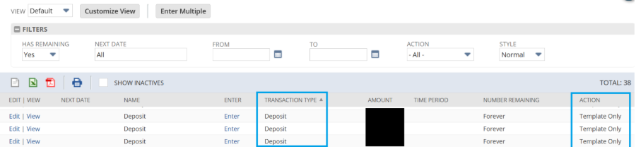 定期としてリストされている預入トランザクションが見つかった場合は、その「アクション」設定に注意してください。このシナリオでは、定期トランザクションが [テンプレートのみ]に設定されている場合は、新しいトランザクションは自動的には生成されず、手動で使用するためのテンプレートにすぎません。関連する定期アクションが見つからない場合は、次のステップを検討してください。