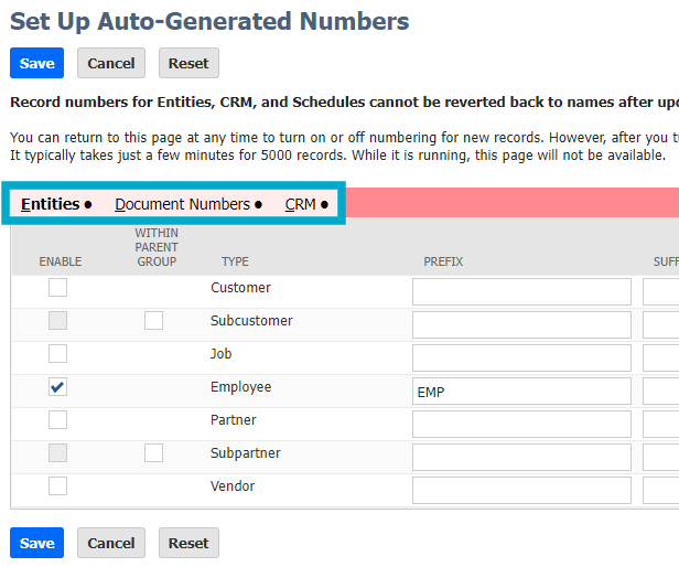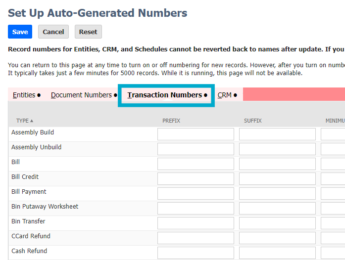 「設定」>「会社」>「自動生成番号」にナビゲートする場合、ユーザーには「エンティティ」、「ドキュメント番号」および「CRM」タブのみが表示されます。「トランザクション番号」タブは使用できないため、「到着荷物番号」は更新できません。