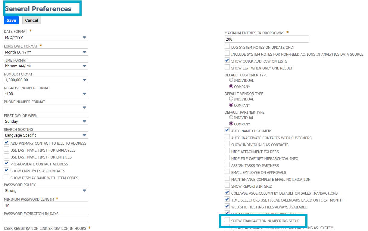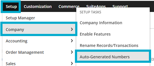 タブが表示されているかどうかを確認するには、「設定」>「会社」>「自動生成番号」>「トランザクション番号」タブにナビゲートします。
