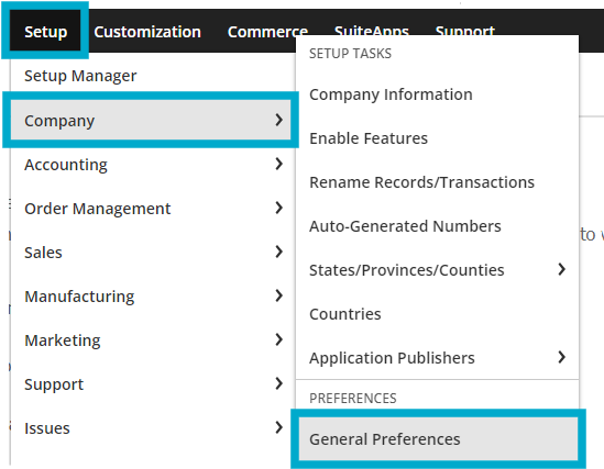 - 「設定」>「会社」>「一般プリファレンス」にナビゲートします