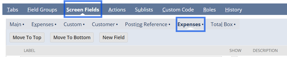 - 「画面フィールド」タブ→「経費」サブタブ(「転記参照」サブタブと「合計ボックス」サブタブの間にあるもの)に移動します。