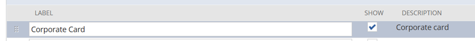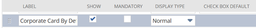 (ノート:これは、デフォルトの勘定科目を経費精算書レベルで上書きできるようにするためです。) - 「デフォルトのコーポレート・カード」を探して、「表示」チェックボックスにチェックマークを入れます。