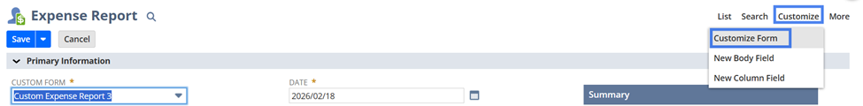 - 「トランザクション」→「従業員」→「経費精算書の入力」にナビゲートします(または、「カスタマイズ」→「フォーム」→「トランザクション・フォーム」にナビゲートし、優先経費精算書フォームで「カスタマイズ/編集」をクリックします)。
