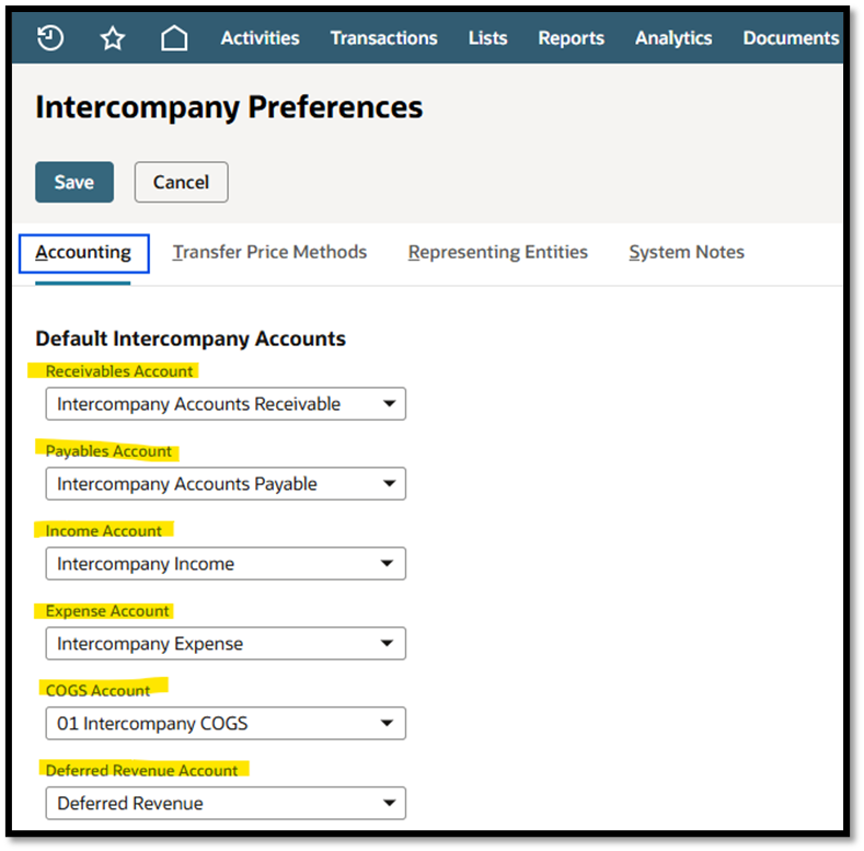 1. 管理者ロールを使用して、「設定」>「会計」>「関係会社間プリファレンス」に移動します。