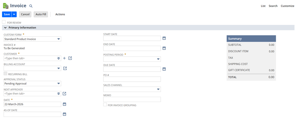 NetSuiteでは、請求書権限によって、ロールが請求書トランザクションを作成、表示、編集または承認できるかどうかが制御されます。通常は、注文書、配送、プロジェクトまたは単独で入力された請求書トランザクションから生成されます。