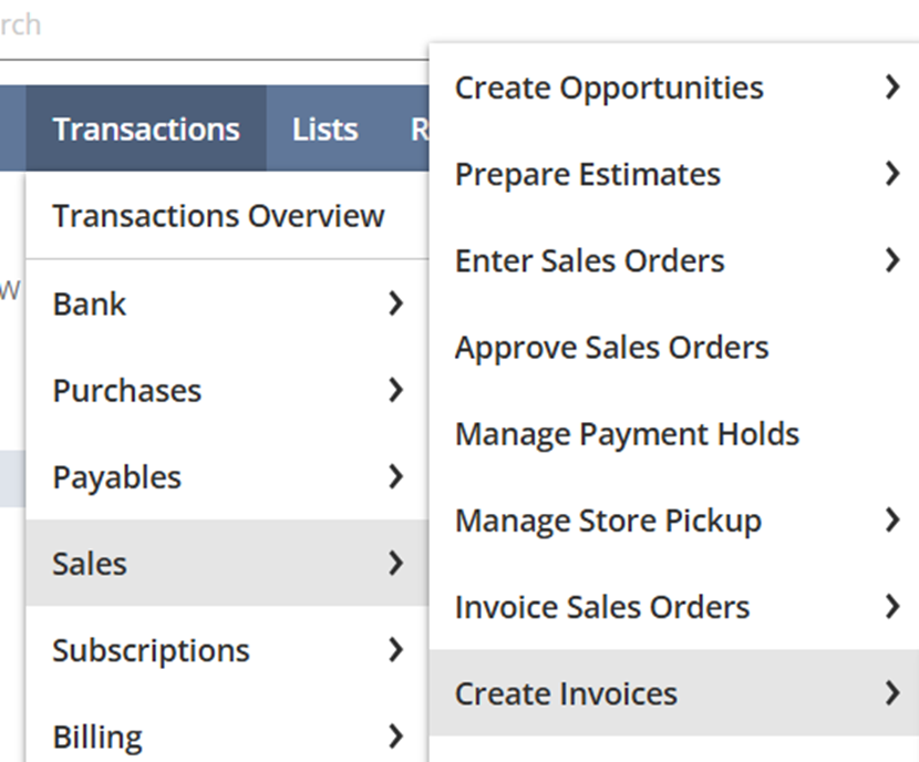 レコードにアクセスするには、「トランザクション」>「販売」>「請求書の作成」にナビゲートします。